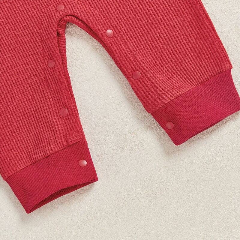 This adorable baby girl jumpsuit is the sweetest holiday outfit for your little one. Made in a cheerful red hue with “Santa Baby” lettering across the front, it’s perfect for Christmas photos, family gatherings, and festive fun. The soft, ribbed fabric keeps her cozy, while the ruffle details on the shoulders add a charming touch. Convenient snaps along the legs make changes quick and easy for busy parents. A must-have piece to celebrate your baby girl’s very first Christmas in style!