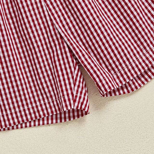 Get your little one ready for the school season with this classic and charming toddler boy set. Featuring a crisp polo-style top with a gingham collar and a cute apple embroidery, it pairs perfectly with matching gingham shorts for a coordinated look. Made from soft, breathable fabric, this outfit keeps him comfortable throughout busy school days and playtime. Timeless, stylish, and school-ready, this set is a perfect choice for back-to-school moments.
