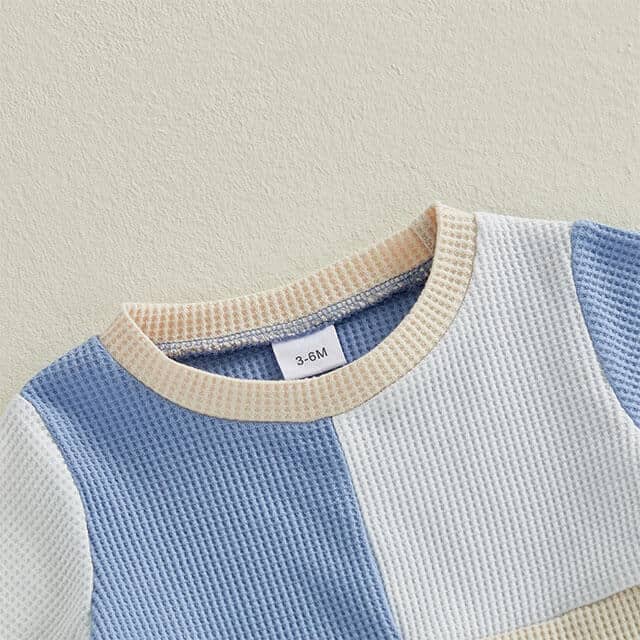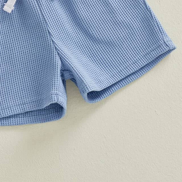 This little boy set features a soft waffle-texture short-sleeve top with a modern color-block design paired with matching comfy shorts for an easy, everyday outfit. Designed with a breathable fabric that’s gentle on delicate skin, the set keeps your little one cool and comfortable during playtime or outings. Perfect for warm-weather days, casual adventures, or lounging at home, this stylish set blends comfort, practicality, and adorable charm for your little boy.