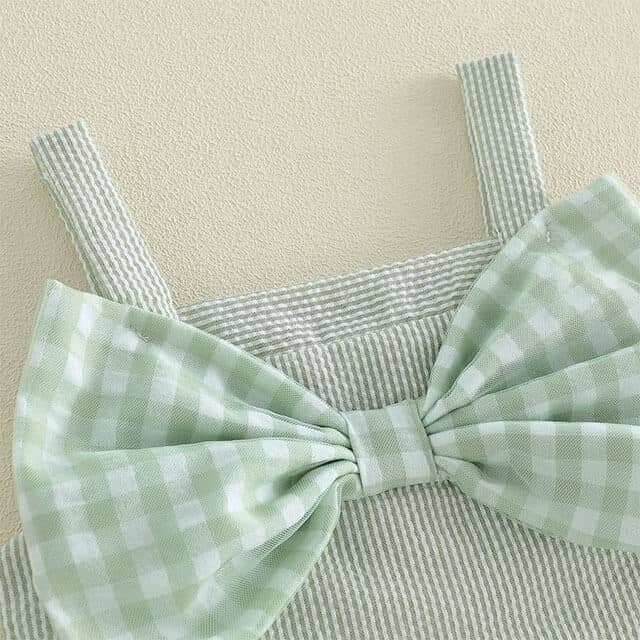Dress your little one in sweet, timeless style with this adorable baby girl gingham set. Featuring a soft striped romper with delicate straps and a charming oversized bow, it brings a perfect mix of classic and playful. The matching layered ruffle skirt adds extra volume and cuteness, making it ideal for special moments and everyday wear. Crafted from lightweight, breathable fabric, it keeps your baby comfortable throughout the day.