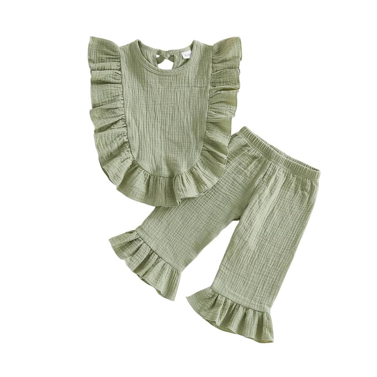 This toddler girl set includes a sleeveless top with soft ruffle details and matching pants with ruffled hems, creating a comfortable and coordinated look. The fabric is lightweight and breathable, making it suitable for everyday wear. The simple, solid design makes it easy to mix and match with other pieces. Available in two colors, this set is a practical and stylish option for toddlers.