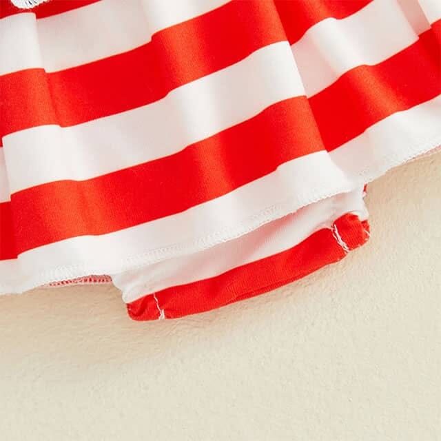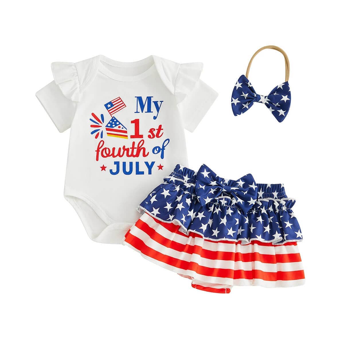 Celebrate your little one’s very first Independence Day in style with this adorable baby girl 3-piece set. Featuring a soft ruffle-sleeve bodysuit with a “My 1st Fourth of July” print, it adds the perfect festive touch for the occasion. The matching star-and-stripe skirted bloomers bring a fun, patriotic flair while keeping your baby comfy all day long. A coordinating bow headband completes the look for the cutest holiday outfit.