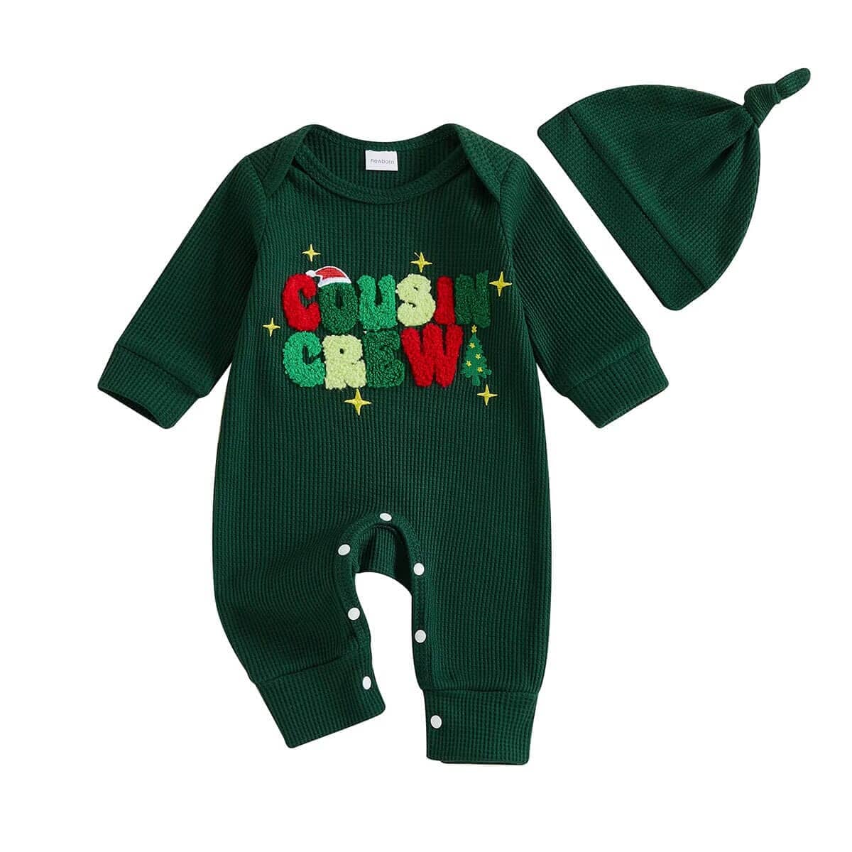 Dress your little one in holiday cheer with this adorable unisex Christmas jumpsuit. The cheerful “Cousin Crew” design with festive details makes it a fun choice for family gatherings and holiday photos. Snap closures along the legs ensure quick and easy diaper changes. Available in green, cream, and burgundy, this jumpsuit is the perfect outfit for celebrating Christmas in style.