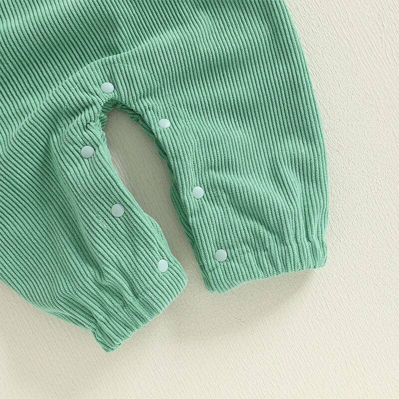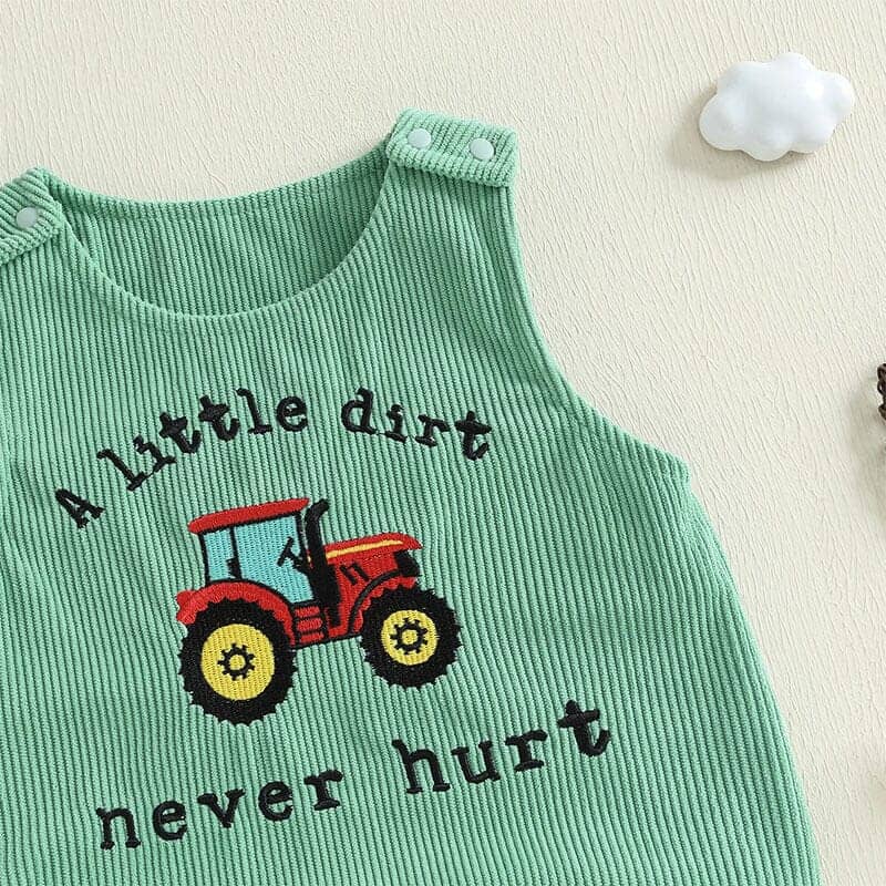 This adorable baby boy jumpsuit is perfect for little explorers who love to play. The green pinstripe design is accented with a fun tractor graphic and the playful phrase “A little dirt never hurt.” Snaps along the legs make diaper changes quick and hassle-free, while shoulder buttons allow for easy dressing. Ideal for everyday wear or outdoor adventures, this jumpsuit combines practicality with charming farm-inspired style.