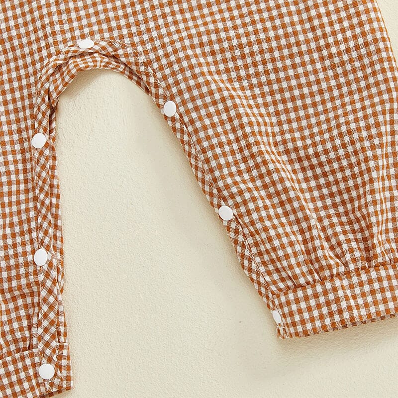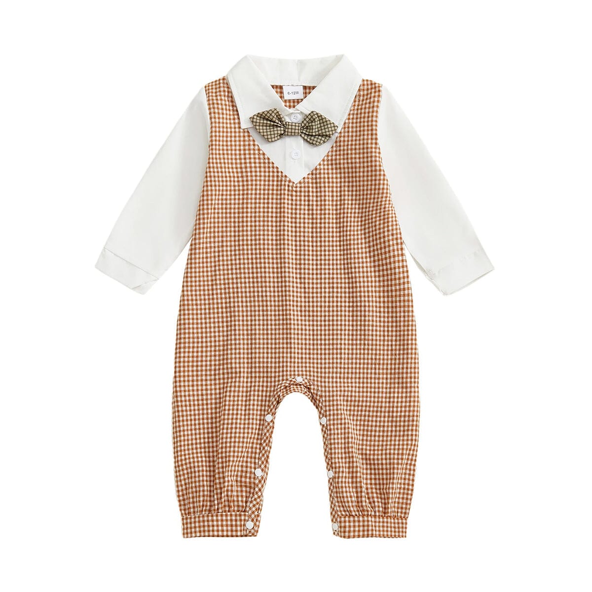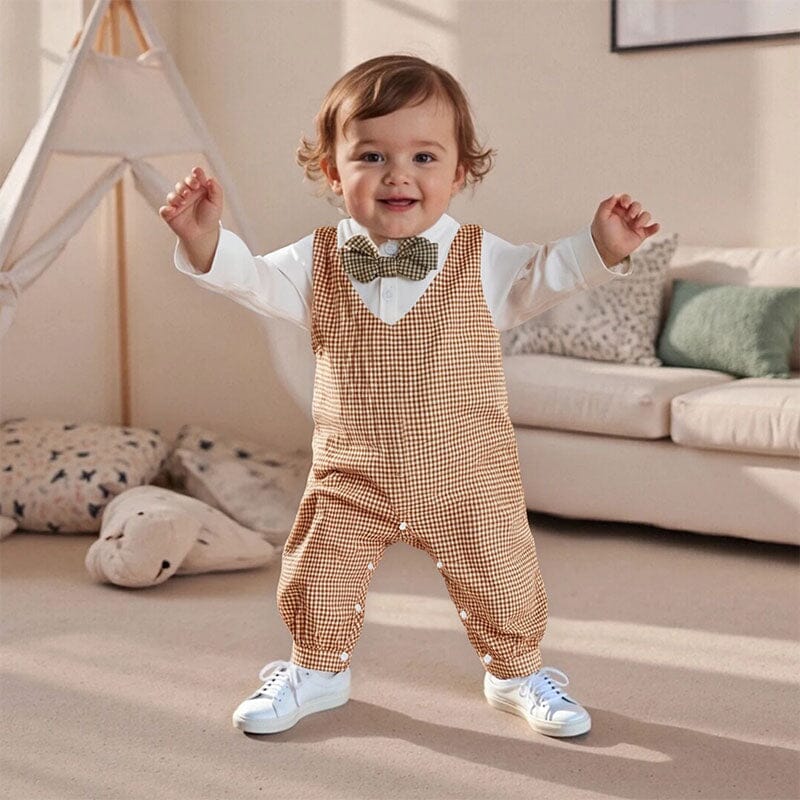Dress your little man in timeless style with this charming baby boy jumpsuit! Designed with a smart white shirt top and a gingham vest-style bodice, it’s perfect for family photos, holidays, or special occasions. The matching bow tie adds an adorable touch of sophistication. This outfit combines classic elegance with practicality for your little gentleman!