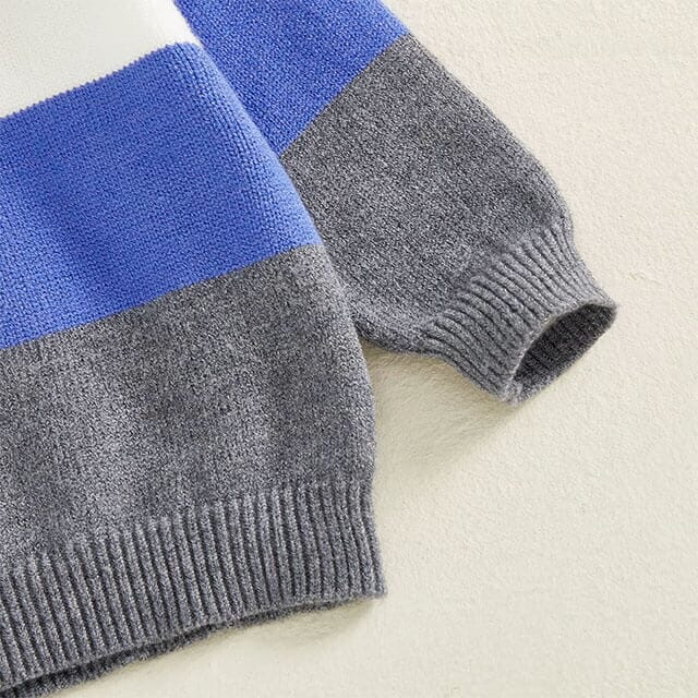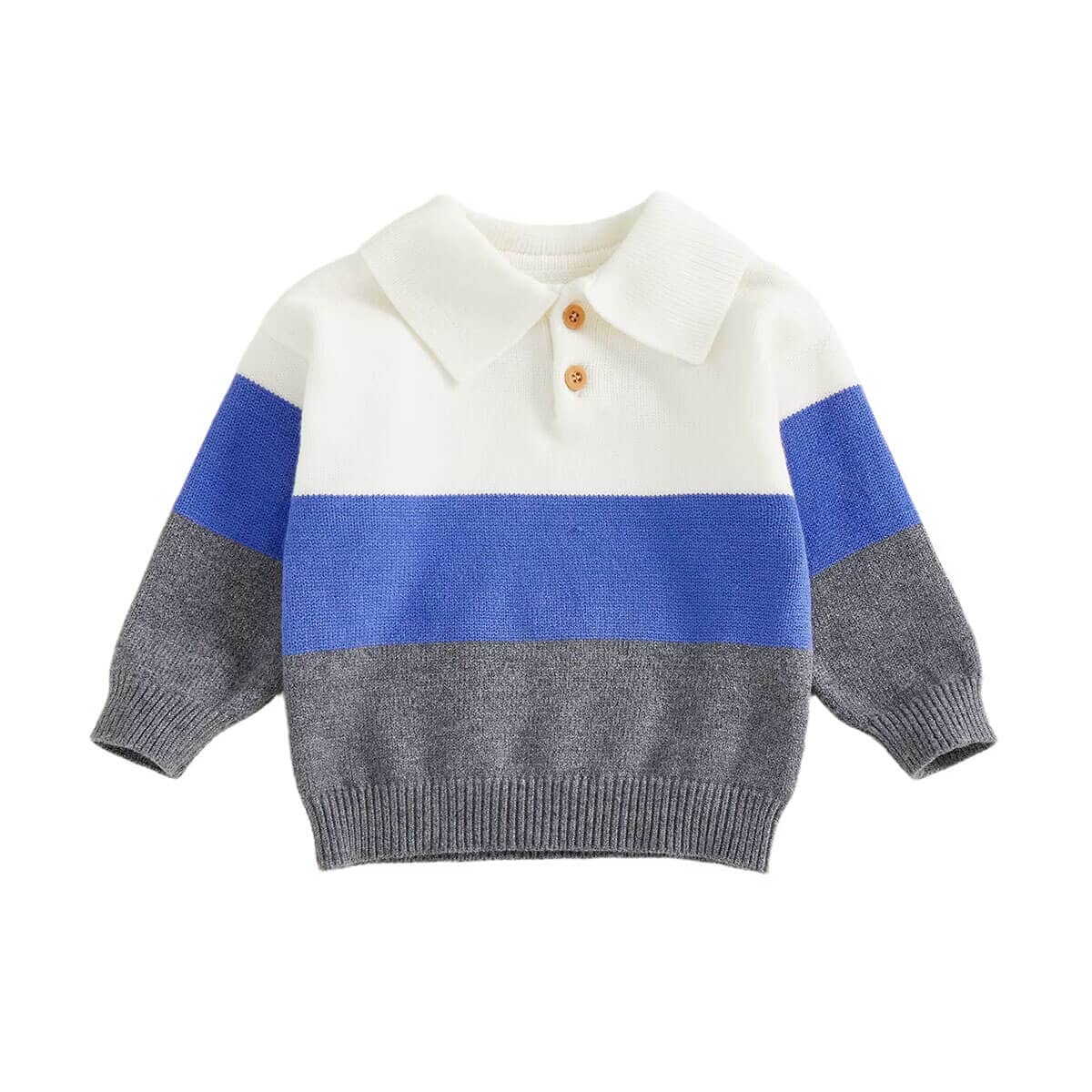 This classic little boy sweater combines comfort and timeless style. Featuring bold color-block stripes in white, blue, and gray, it brings a fun yet polished look perfect for any occasion. The collared neckline with button details adds a touch of sophistication, making it great for layering or wearing on its own. Crafted from soft, cozy knit fabric, it keeps your little one warm during cooler days. Ideal for family outings, holidays, or everyday wear, this sweater is a must-have in any boy’s wardrobe.