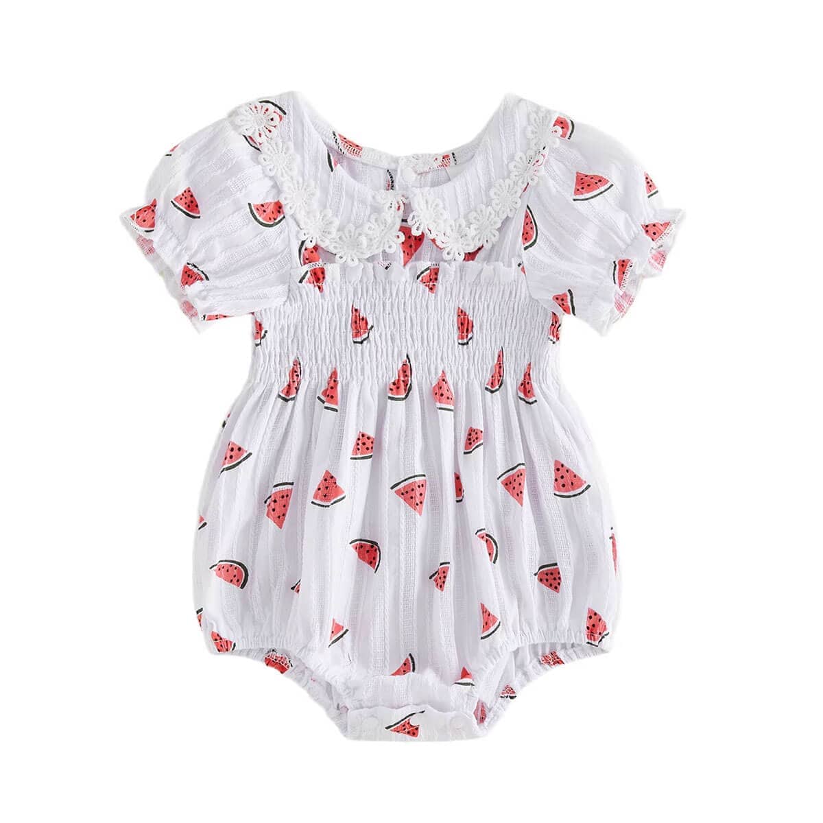 This sweet baby girl romper features a playful watermelon print with delicate lace details for an extra charming touch. Made from lightweight, breathable fabric, it keeps your little one comfortable on warm days. The smocked bodice provides a flexible fit while the puff sleeves add a classic, feminine look. Snap closures at the bottom make diaper changes quick and easy.