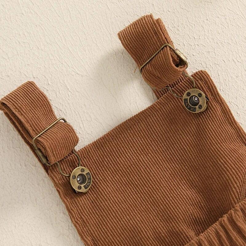 This adorable baby girl outfit combines sweet style with everyday comfort. The set includes a ribbed long-sleeve bodysuit with ruffle details on the shoulders, adding a touch of charm to the look. It pairs beautifully with a corduroy suspender skirt featuring button accents and an elastic waistband for a cozy fit. Available in two colors, you can choose a soft beige bodysuit for a classic look or a sleek black bodysuit for a bolder style. Perfect for family photos, outings, or special occasions, this set is both stylish and practical.