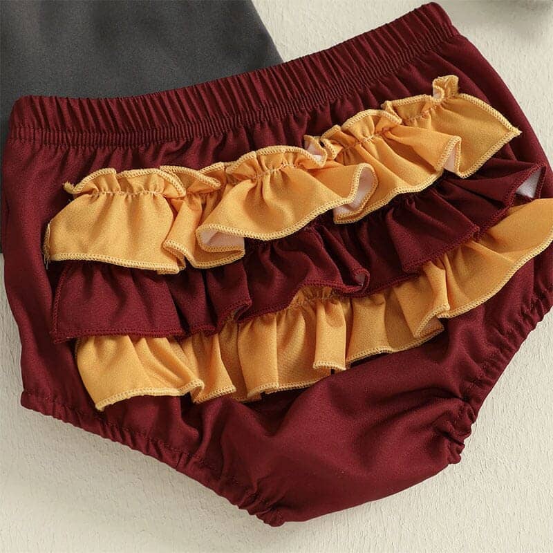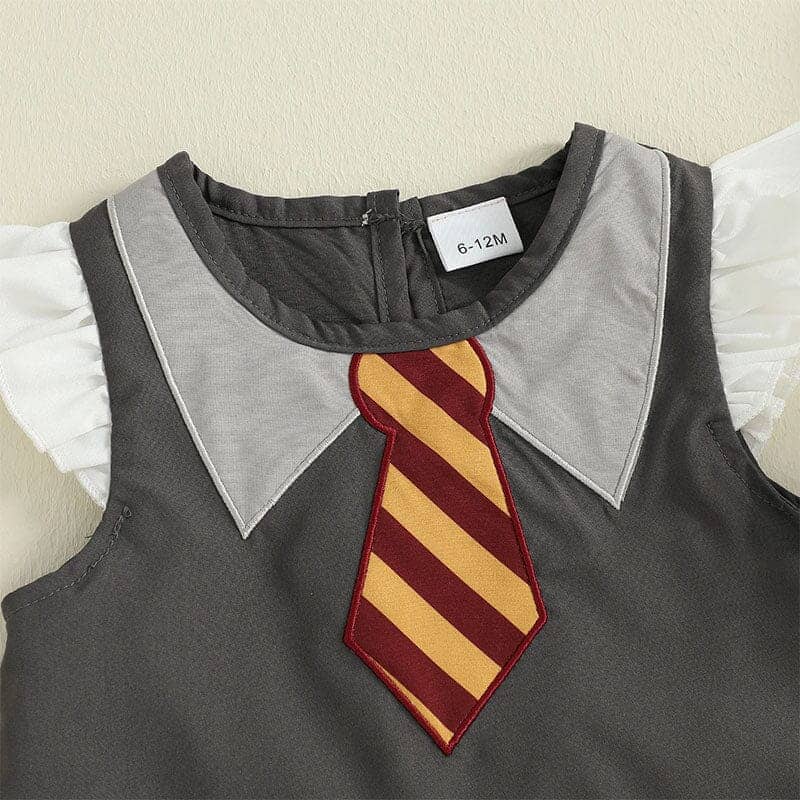 Dress your little one in magical style with this adorable baby girl set. The sleeveless top features a playful printed tie design and ruffled white shoulders, giving a charming school-uniform look inspired by wizarding vibes. Paired with soft, comfy burgundy bloomers, this outfit is both stylish and easy to wear.