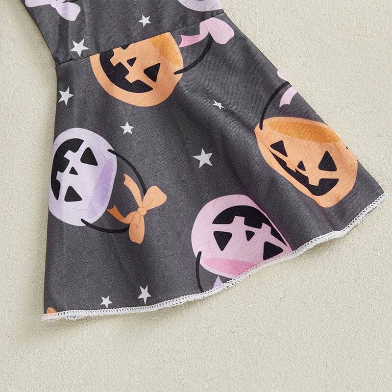This adorable toddler girl set is a sweet and spooky pick for Halloween festivities. The lavender short-sleeve top features playful jack-o’-lanterns with bows and the phrase “Here for the Candy,” making it perfect for trick-or-treating adventures. The matching bell-bottom pants are covered in a fun Halloween print with pastel pumpkins and stars for a festive yet stylish look.