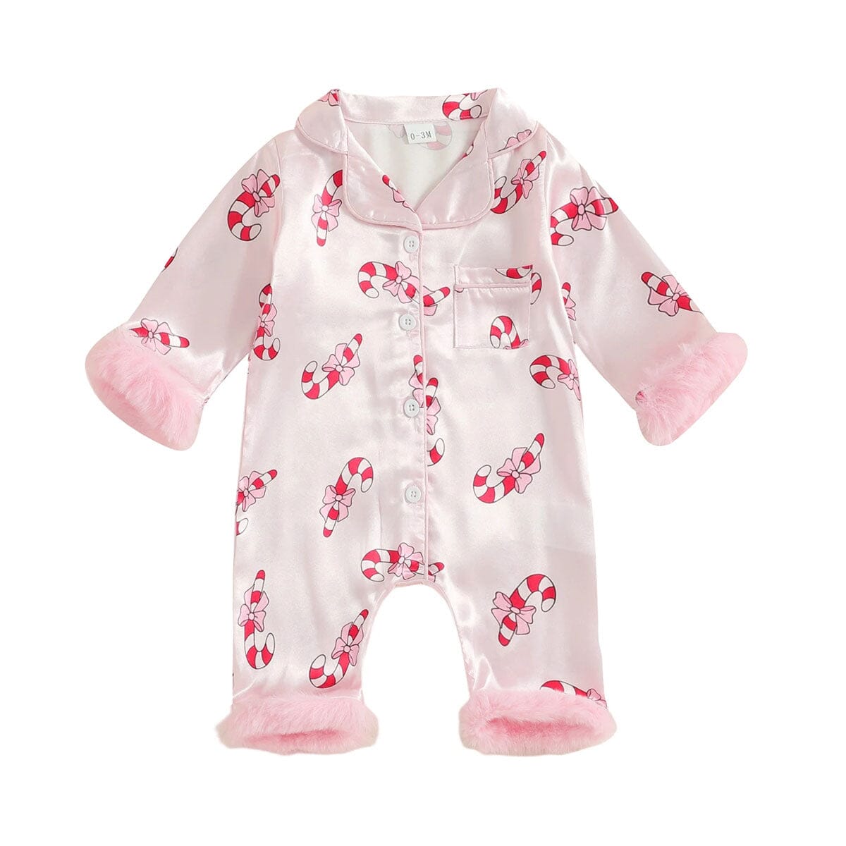 This sweet baby girl jumpsuit is a festive and cozy choice for the holiday season. Made from silky-soft fabric, it features an allover candy cane print with adorable bow details, perfect for Christmas celebrations. The button-up front makes dressing simple, while the fluffy pink trim on the sleeves and cuffs adds extra charm and warmth. Designed for both style and comfort, it can be worn as a festive outfit or as comfy Christmas pajamas.