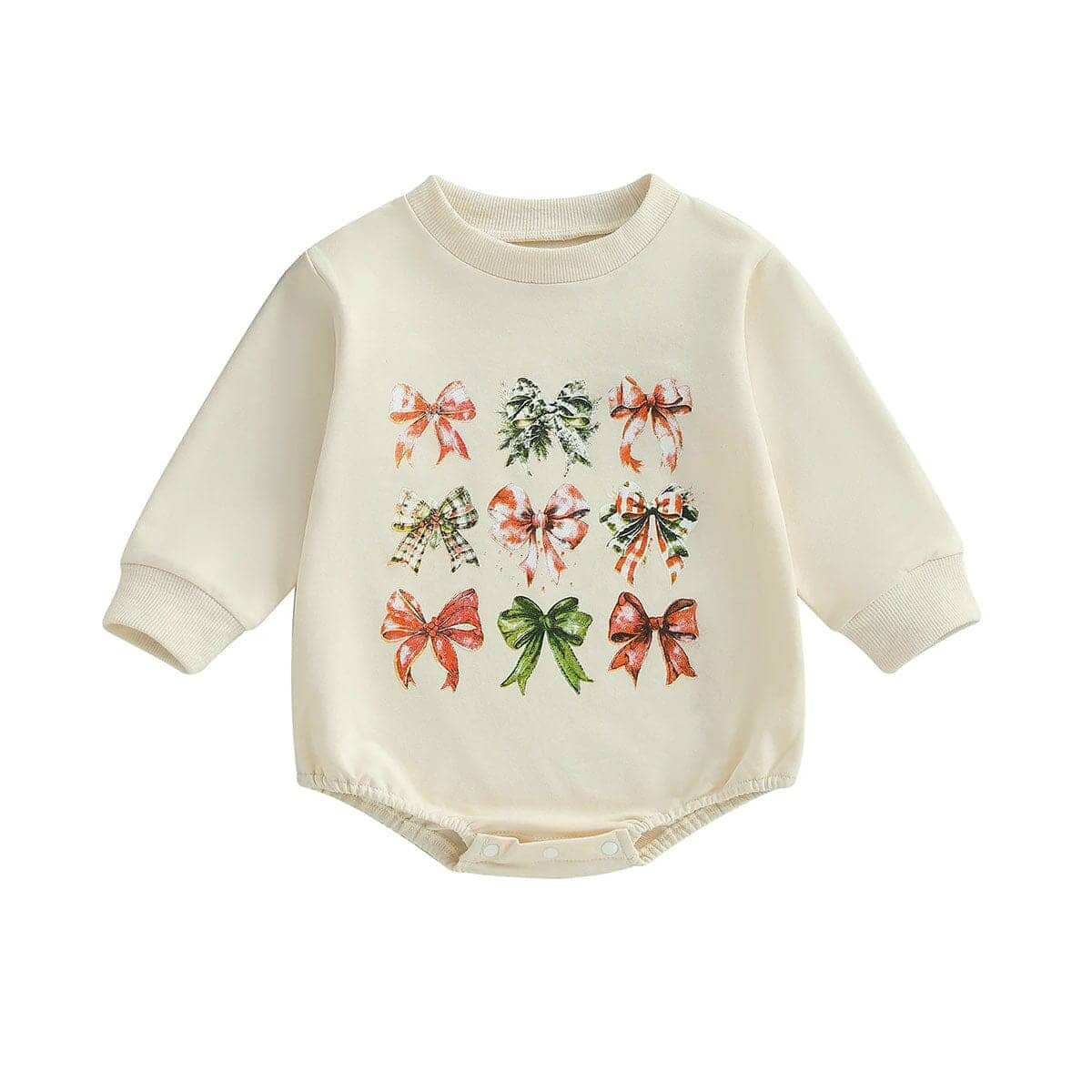 This adorable baby girl bodysuit is a festive must-have for the holiday season. It features a charming print of nine colorful Christmas-inspired bows, adding a playful and cheerful touch. The long sleeves and snap closures at the bottom make it practical for cooler days and easy diaper changes. Available in two beautiful colors – classic cream and vibrant pink – it's the perfect outfit for Christmas celebrations and photos.