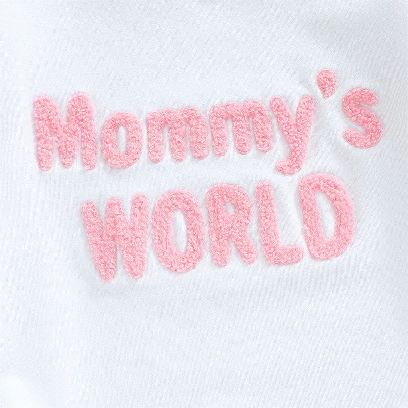 This baby girl bodysuit is a sweet and cozy everyday essential. Designed in white with soft pink long sleeves, it features the adorable fuzzy-textured words "Mommy’s World" across the front, making it perfect for showing off your little one’s special bond with mom. The stretchy fabric and snap closures at the bottom ensure easy dressing and diaper changes. Perfect for daily wear, playdates, or gifting, this bodysuit is both stylish and practical for your little girl.