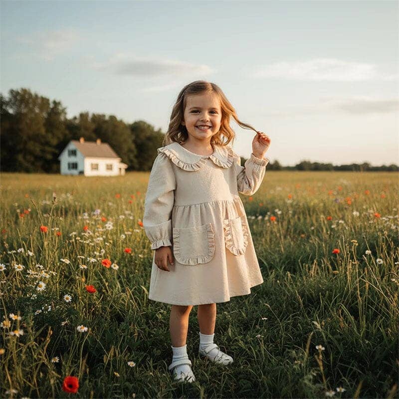 This sweet toddler girl dress is all about timeless charm and everyday comfort. It features adorable ruffled details along the Peter Pan collar and front pockets, giving it a soft, vintage-inspired look. The long sleeves and relaxed fit make it cozy for cooler days while allowing easy movement. Available in two beautiful colors, it’s a must-have piece for your little one’s wardrobe.