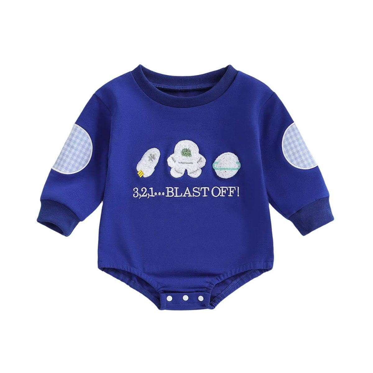 This baby boy bodysuit is designed with a fun outer space theme, featuring embroidered rocket, astronaut, and planet details along with the playful text “3,2,1… BLAST OFF!”. The bold royal blue color makes it stand out, while the gingham elbow patches add a cute and stylish touch. The snap closures at the bottom make diaper changes quick and easy. Perfect for everyday wear or as a fun outfit for photos and playtime.