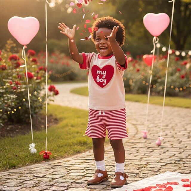 This adorable little boy set is the perfect outfit for celebrating Valentine’s Day in style. The top features a bold red heart patch with “my boy” embroidered on it, adding a cute and loving touch. Matching striped shorts with a comfy elastic waistband ensure easy movement and all-day comfort. Soft, breathable fabric makes this set ideal for playdates, photos, or festive holiday outings. Whether for Valentine’s celebrations or everyday sweetness, this outfit is sure to melt hearts.