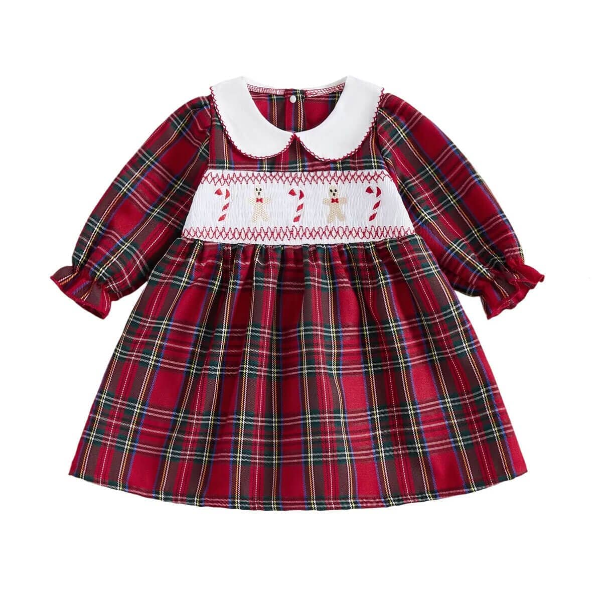 This toddler girl dress is the perfect holiday outfit for Christmas celebrations. Made with a classic red plaid fabric, it features charming embroidered candy canes on the smocked chest for a festive touch. The white Peter Pan collar and long puff sleeves add a sweet, traditional look that’s both cozy and stylish. Its buttoned back makes dressing quick and easy, while the soft material keeps your little one comfortable all day. Whether for family gatherings, photos, or holiday parties, this dress is a timeless Christmas favorite.
