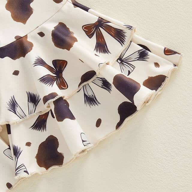 This adorable toddler girl set combines sweet charm with trendy western-inspired style. The ruffle-sleeve smocked top offers a comfy, stretchy fit while adding a touch of playful elegance. Paired with flared bell-bottom pants featuring a fun cow-print and bow pattern, this outfit is perfect for making a statement. Ideal for playdates, outings, or photos, this stylish set is a must-have for your little fashionista.