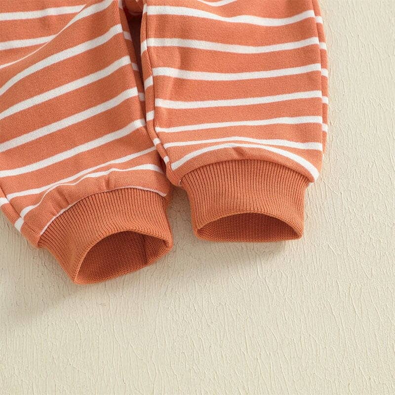 This adorable little boy’s set is perfect for celebrating Halloween in style and comfort. The long-sleeve striped top features a bold jack-o’-lantern design on the front, adding a fun festive touch. Matching striped jogger pants with an adjustable drawstring waist ensure a cozy fit for active play. A playful yet practical outfit, it’s a great pick for Halloween and beyond.