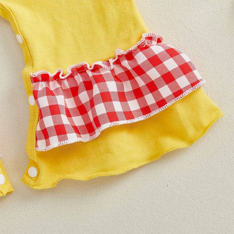 Brighten up your little one’s day with this cheerful farm-themed baby girl jumpsuit. The vibrant yellow base is beautifully accented with red gingham ruffles at the collar, cuffs, and legs for a playful country charm. A barnyard applique featuring a cute hen adds a fun, storybook feel to the front. Perfect for spring outings, farm visits, or simply cozy play at home!
