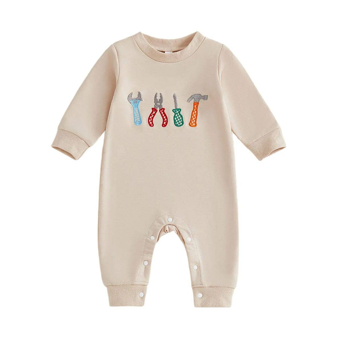 This baby boy jumpsuit is a fun and playful outfit, perfect for little ones who love to explore. Designed in a neutral beige color, it features colorful embroidered tool graphics on the chest, including a wrench, pliers, screwdriver, and hammer, giving it a cute "little builder" vibe. Snap closures along the legs make diaper changes quick and easy. Whether for everyday wear or a themed photo shoot, this jumpsuit is a charming addition to your little boy’s wardrobe.