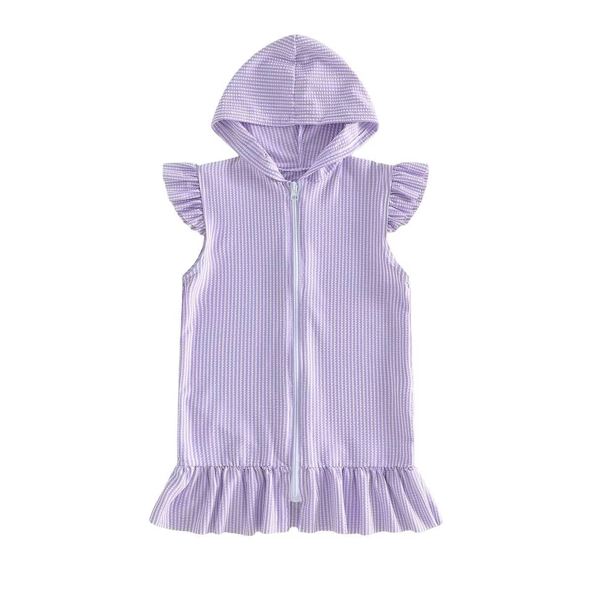 Keep her cute and comfy by the water with this adorable toddler girl cover-up. Designed with a lightweight textured fabric, it features sweet ruffle sleeves and a playful ruffled hem for extra charm. The full front zipper makes it easy to slip on and off over swimsuits, while the cozy hood adds extra coverage for breezy beach days. Perfect for poolside fun, beach trips, or summer vacations, it offers both style and practicality. This must-have cover-up is the perfect finishing touch to her warm-weather wardrobe.