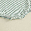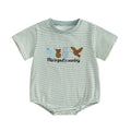 This baby boy romper is a charming piece inspired by the great outdoors. It features a soft green and white stripe pattern and playful embroidered nature motifs including a fish, deer, owl, and bird, along with the phrase “this is god’s country.” The snap closures at the bottom make diaper changes quick and easy. Perfect for warm-weather outings, this romper brings a rustic, country vibe to your baby’s everyday look.