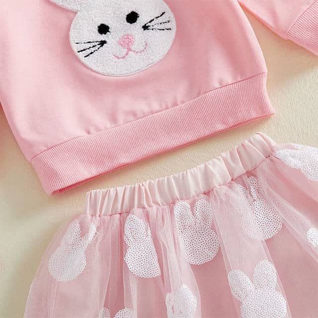 This adorable toddler girl set features a cozy long sleeve top with a cute bunny face design paired with a soft tulle skirt decorated with matching bunny silhouettes, making it perfect for Easter celebrations, spring outings, photoshoots, and special occasions. This charming bunny outfit is a lovely choice for Easter egg hunts, family gatherings, and creating sweet spring memories in your toddler girl’s wardrobe.