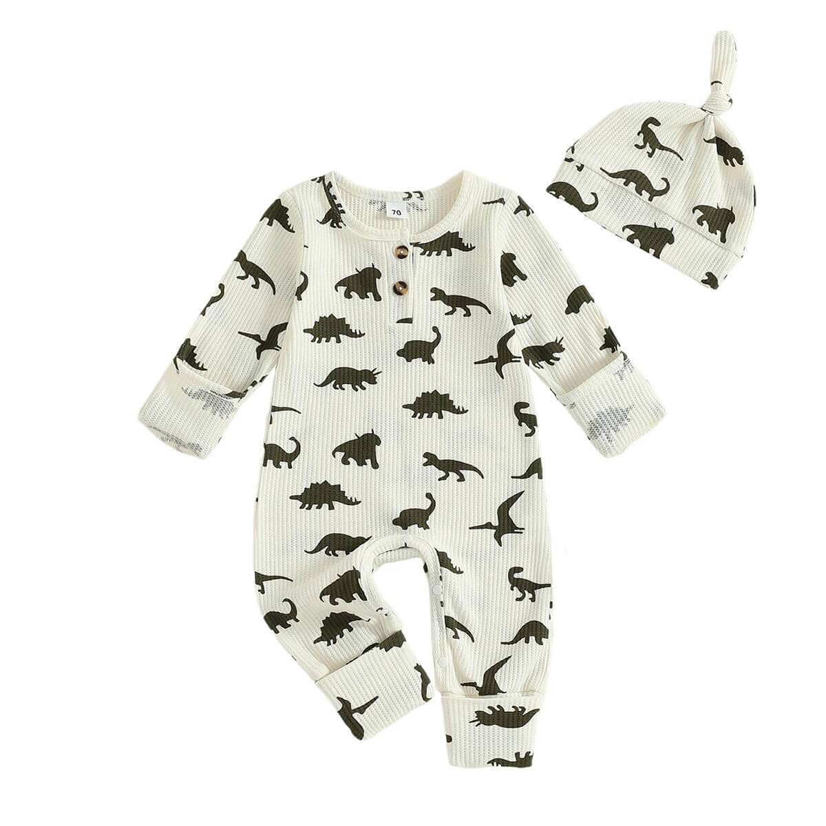 This adorable baby boy jumpsuit features an allover dinosaur print that little explorers will love. Designed with long sleeves and cozy cuffs, it's both stylish and practical for everyday wear. The front buttons add a classic touch while making dressing quick and easy. Complete with a matching knotted hat, this set is perfect for playful days or cozy snuggles.