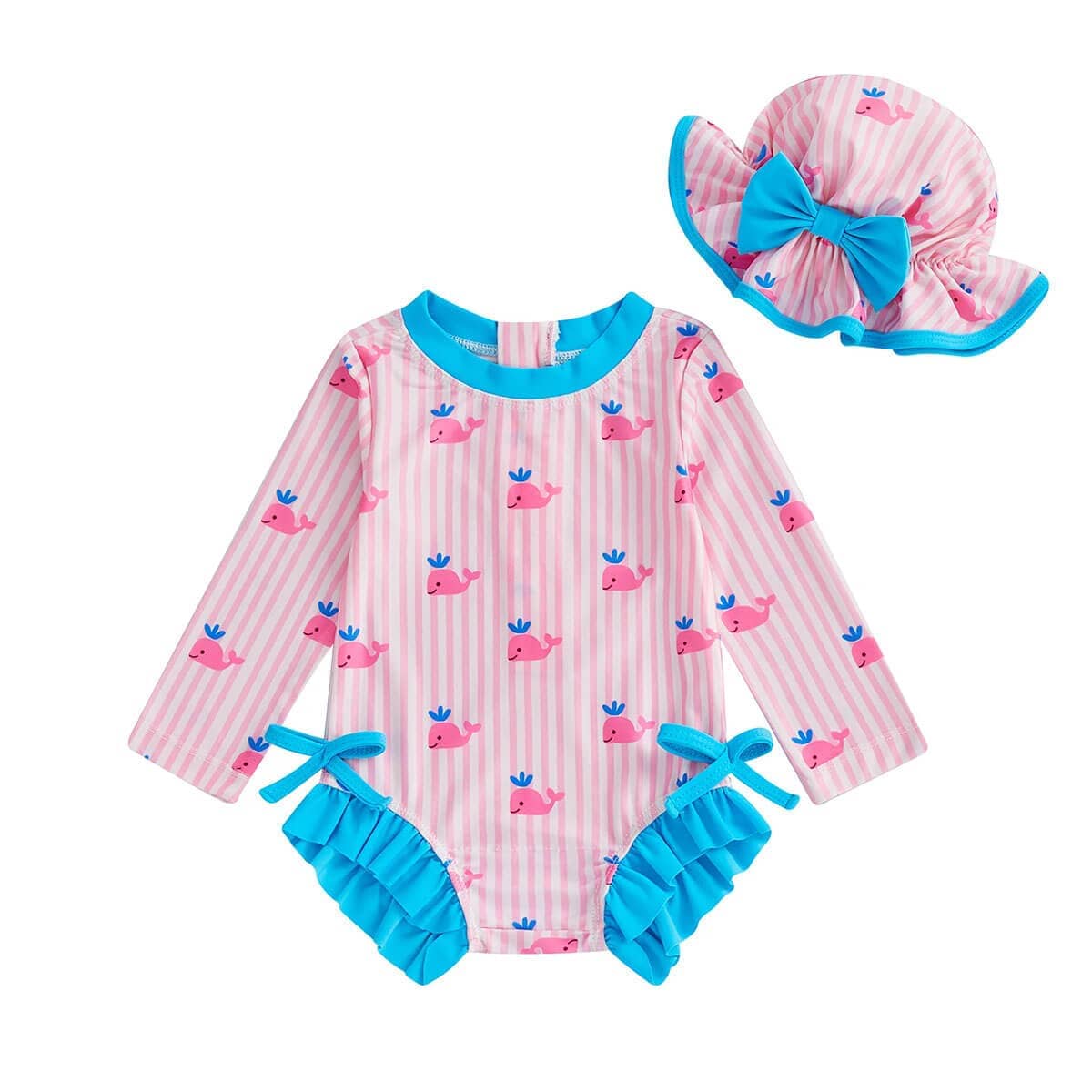This adorable baby girl swimsuit is perfect for fun days at the beach or pool. Featuring a sweet whale print with soft pink stripes and bright blue accents, it creates a playful and cheerful summer look. The long sleeves help provide extra sun coverage, while the soft stretch fabric keeps your little one comfortable in and out of the water. Cute ruffle details and side bows add an extra touch of charm to this stylish design. The matching sun hat with a bow completes the set, making it both practical and irresistibly cute for sunny adventures.
