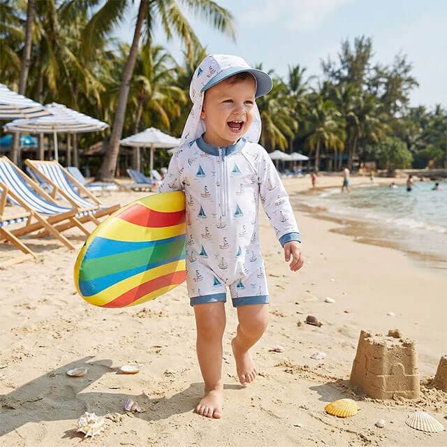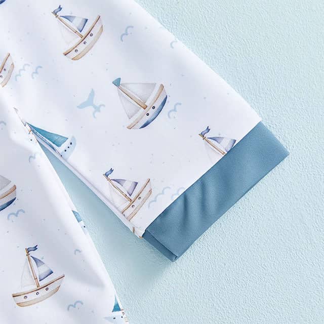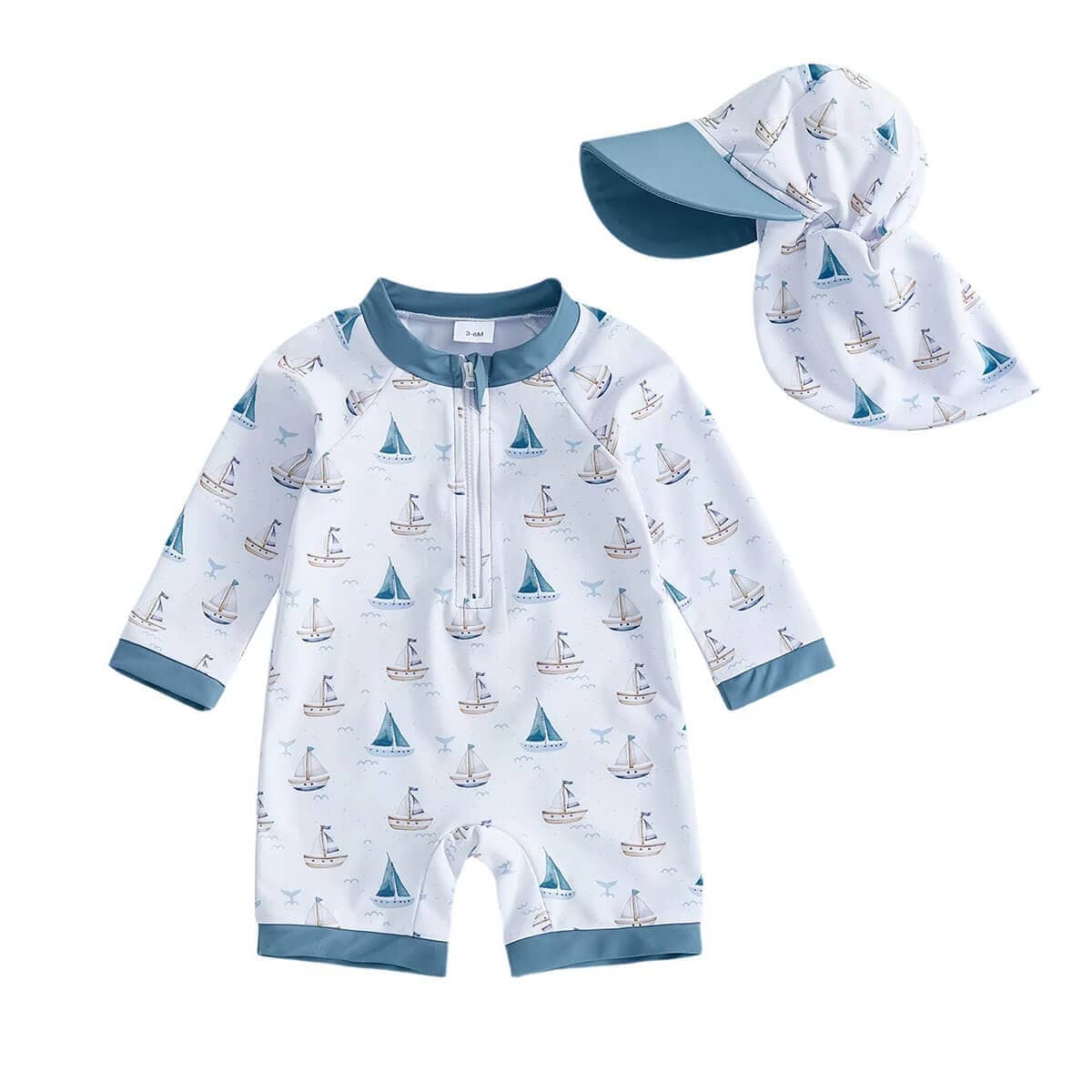 This adorable little boy swimsuit features a charming sailboat print and comes with a matching sun hat for a perfectly coordinated beach look. Designed with long sleeves and a front zipper closure, it provides extra coverage and makes dressing quick and easy. The lightweight, quick-drying fabric keeps your little one comfortable in and out of the water. Soft stretch material allows for easy movement during swimming and play. Perfect for beach days, pool time, and sunny summer adventures.