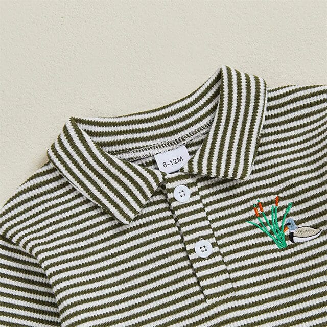 This stylish little boy set combines comfort and charm for everyday wear. The striped long-sleeve top features a classic polo collar and a fun embroidered duck detail for a playful touch. Matching jogger pants with an elastic waistband ensure a comfy, flexible fit for active little ones. Cute, cozy, and easy to wear—this set is a must-have for your little explorer!