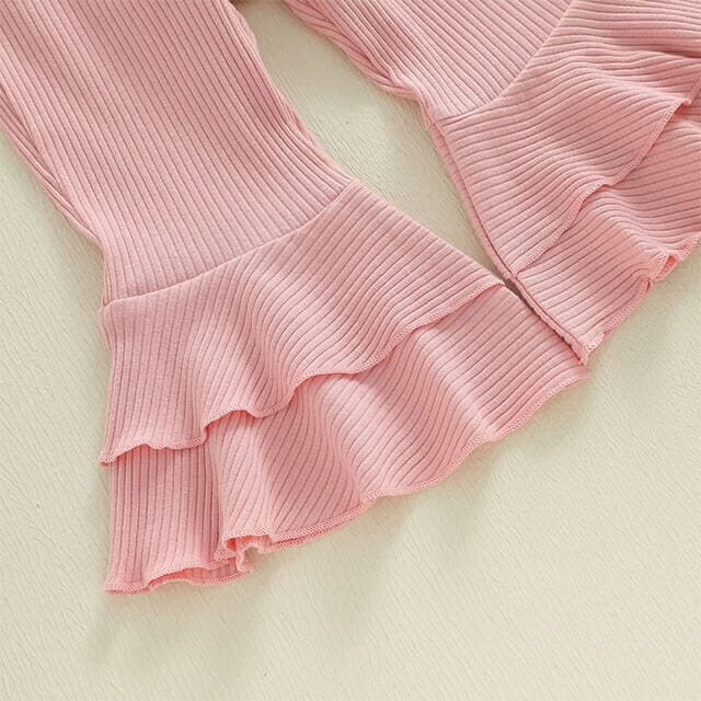 This adorable baby girl set is the perfect blend of sweet style and everyday comfort. The striped bodysuit features soft ruffle shoulders and convenient snaps for easy changing. Matching flared pants with double ruffle hems add a fun, girly touch that makes the whole outfit stand out. A coordinating bow headband completes the look for picture-perfect outfits. Ideal for outings, photos, or simply keeping your little one comfy and cute all day long.