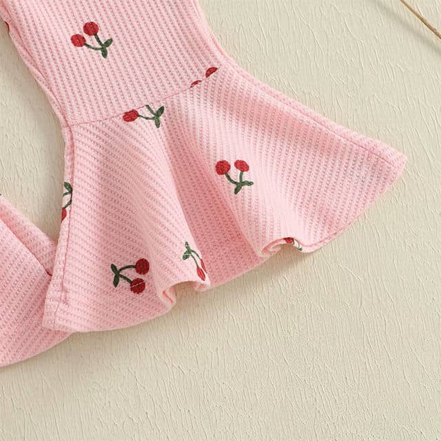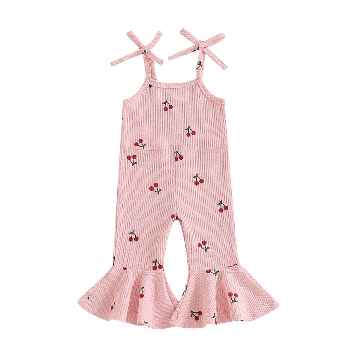 This adorable toddler girl jumpsuit is perfect for warm days and playful adventures. Featuring a sweet cherry print on soft pink fabric, it creates a cute and cheerful summer look. The adjustable tie shoulder straps ensure a comfortable fit while adding an extra charming detail. Flared ruffle legs give the outfit a stylish and playful touch that little girls will love. Soft, breathable fabric keeps your toddler comfortable all day long, making it perfect for playdates, outings, and sunny family moments.