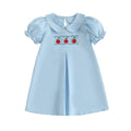 This sweet light blue back-to-school dress is a timeless pick for your little learner. It features classic puff sleeves, a scalloped Peter Pan collar, and delicate smocking with three embroidered red apples across the chest. The front pleat adds a polished touch, while the soft fabric ensures all-day comfort. Perfect for school pictures or a memorable first day, this dress is as adorable as it is practical.