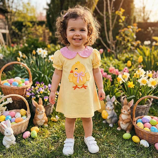 This adorable toddler girl dress features a sweet chick appliqué with a charming bow detail and a classic gingham Peter Pan collar, making it perfect for Easter celebrations, spring photos, family gatherings, or everyday wear. Designed with soft puff sleeves and a comfortable, relaxed fit, it allows easy movement while keeping your little one stylish and cozy throughout the day.