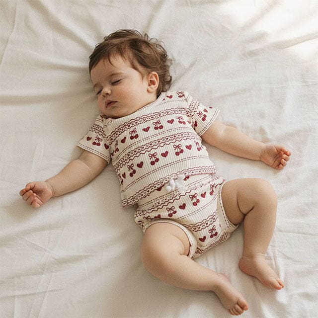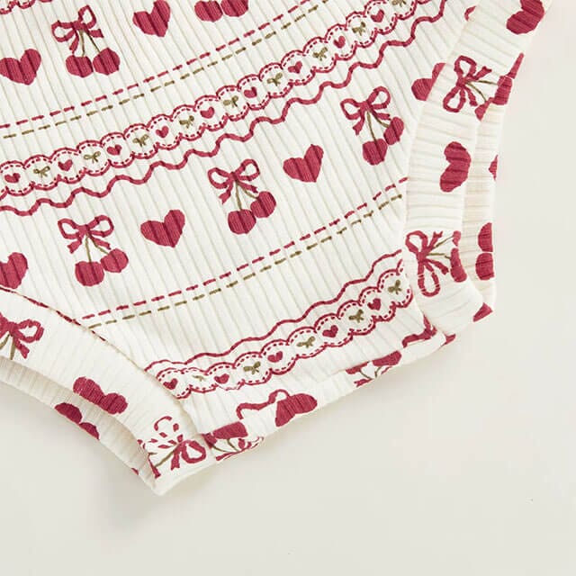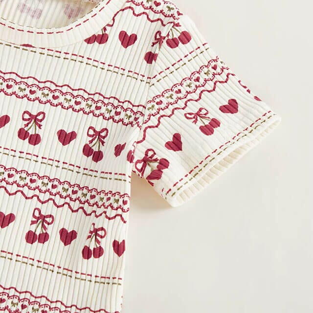This adorable baby girl set is perfect for celebrating Valentine’s Day in the cutest way. The soft ribbed fabric features an allover print of hearts, bows, and cherries for a charming holiday look. The short-sleeve top and matching high-waisted shorts keep your little one comfy and stylish. With its lovely Valentine-inspired design, this set is sure to make your sweetheart shine.