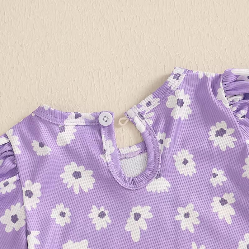 This sweet baby girl set is full of playful charm and springtime vibes. It features a soft lavender ribbed fabric adorned with white floral prints, creating a fresh and cheerful look. The puff-sleeve romper has a keyhole button at the back for easy dressing and snap closures at the bottom for quick changes. Matching ruffled shorts with a dainty bow and a coordinating headband complete the adorable outfit. Perfect for sunny days, photo ops, or casual outings, this 3-piece set is a must-have for your little blossom.