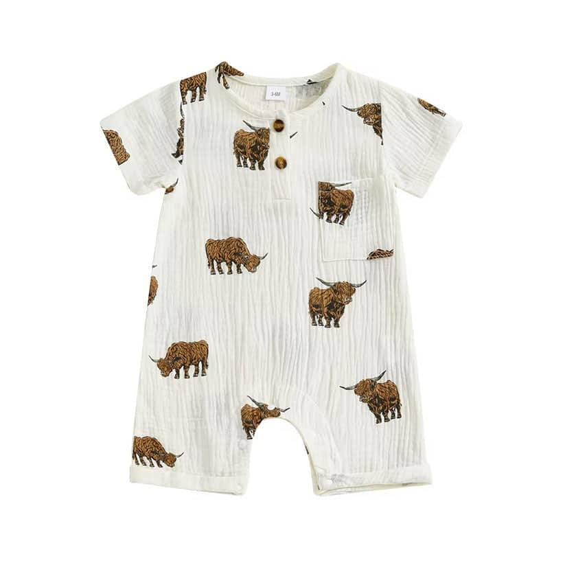 This adorable baby boy romper features a charming Highland cow print that adds a playful and unique touch to your little one’s outfit. Made from soft, breathable fabric, it keeps your baby comfortable throughout the day, whether at home, on outings, or during special moments. The front button detail and convenient snap closures make dressing and diaper changes quick and easy, while the relaxed fit allows for natural movement.