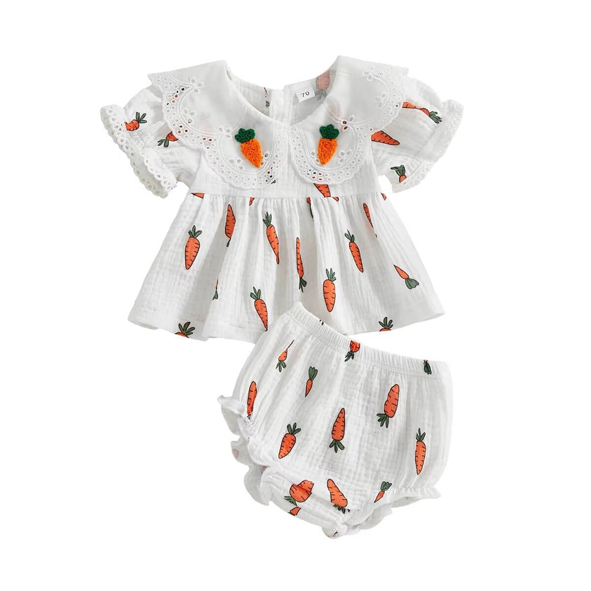 This adorable baby girl set is perfect for Easter and sweet spring days. The outfit features a charming carrot print top with delicate lace collar details and cute carrot appliqués, paired with matching ruffle bloomers for a coordinated and festive look. The elastic waistband ensures a gentle and flexible fit, making this set both stylish and practical for your baby girl’s Easter wardrobe.