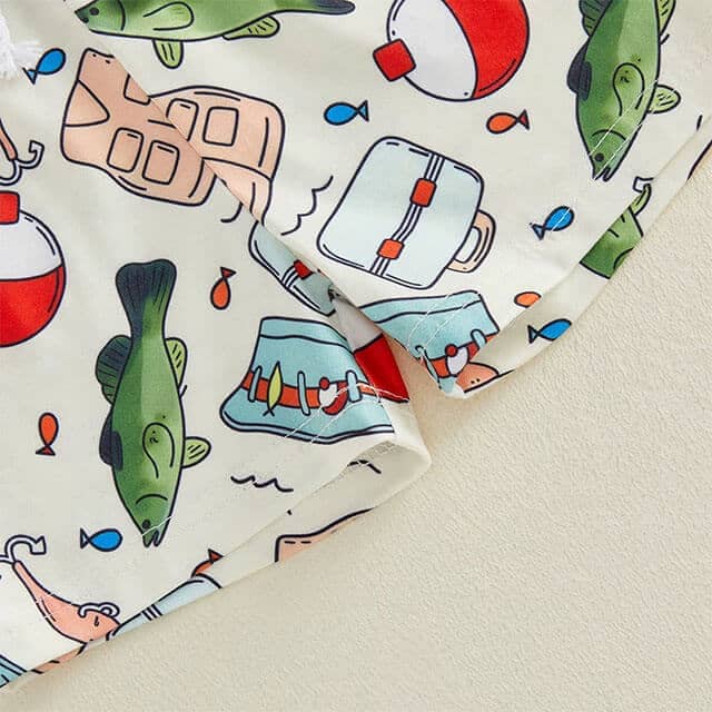This adorable little boy set is perfect for your little fishing buddy! The short sleeve top features a fun “Love My Daddy” fishing-themed print with bright and playful details, while the matching shorts are covered in colorful fishing gear and fish patterns for an extra cute touch. Lightweight and breathable, this outfit is ideal for summer days, family outings, and special moments with dad.