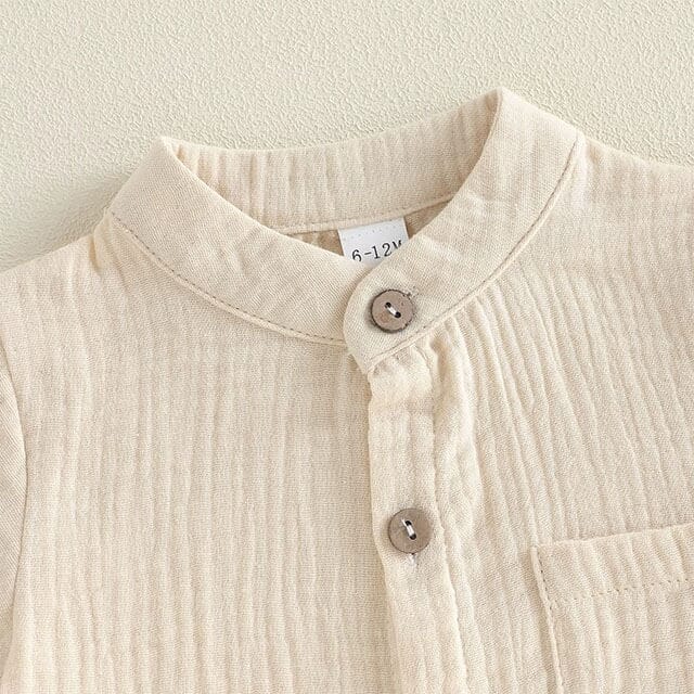 This charming little boy set is designed for comfort with a clean, timeless look. It features a lightweight short-sleeve button-up shirt with a soft textured fabric, classic collar, and chest pocket, paired with matching elastic-waist shorts for easy movement and all-day comfort. Simple yet stylish, this set is ideal for everyday wear, family gatherings, or photos.