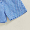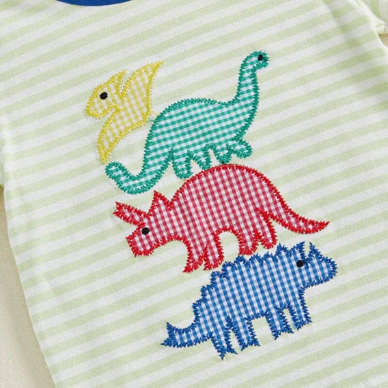 Let your little one roar into style with this adorable dinosaur-themed boy set. The striped tee features a fun stack of colorful dinosaurs, perfect for dino lovers. Paired with blue gingham shorts, this outfit brings playful charm to everyday adventures. Ideal for warm days, trips to the park, or simply lounging in dino-mite style!
