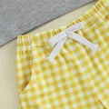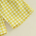 This adorable little boy set is perfect for your truck-loving toddler. The grey t-shirt features fun construction vehicle prints in vibrant yellow tones that spark curiosity and imagination. Paired with yellow and white gingham shorts, the outfit brings a cheerful and playful vibe to any summer day. Whether he's off to the playground or hanging out at home, this outfit keeps him looking cute and feeling cool.