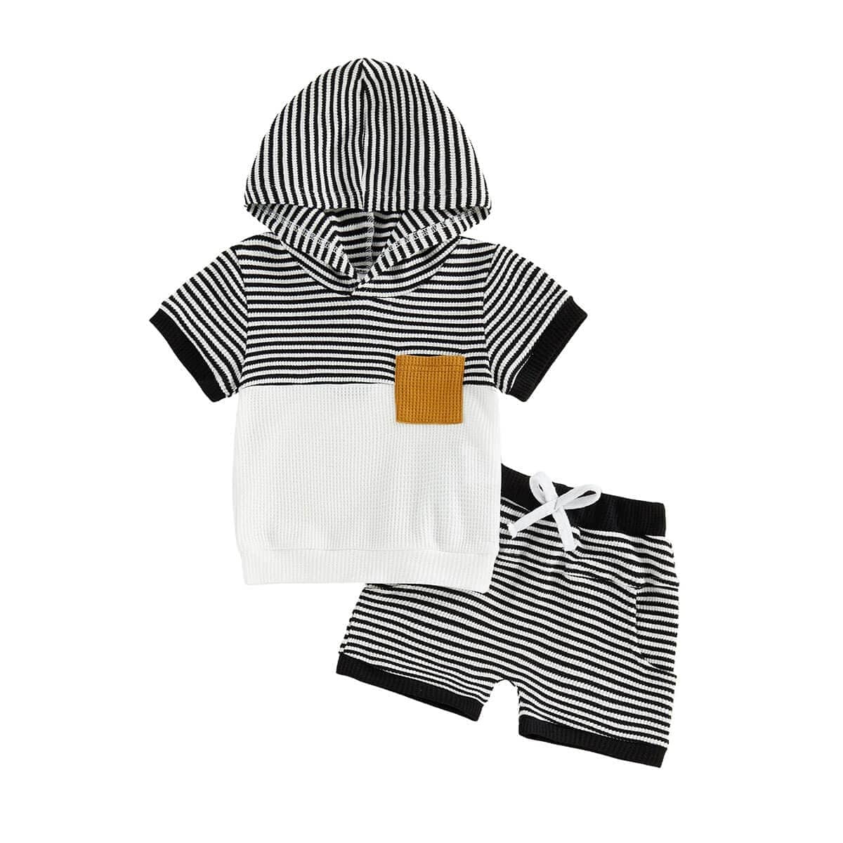 This adorable baby boy set includes a short sleeve hooded top and matching shorts, designed for comfort and everyday style. The top features a modern striped design with a cozy hood and a cute contrast pocket detail, while the matching shorts have an elastic waistband with an adjustable drawstring for a secure and comfortable fit. Made from soft, breathable fabric, this lightweight set is perfect for warm days, playtime, outings, or relaxing at home.