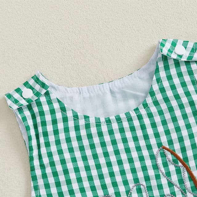 This adorable baby boy romper is perfect for little outdoor adventures and warm sunny days. Featuring a classic green gingham pattern with a cute fishing-themed applique, it adds a playful and charming touch to your baby’s outfit. The lightweight and breathable fabric keeps your little one comfortable while allowing easy movement throughout the day. Convenient snap closures at the bottom make diaper changes quick and simple for parents.