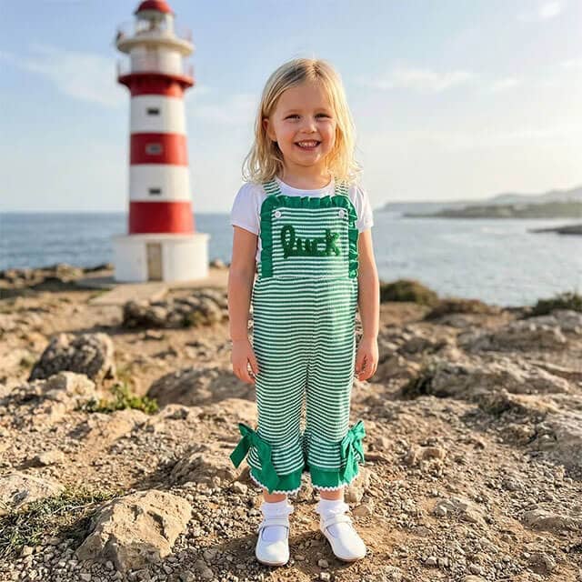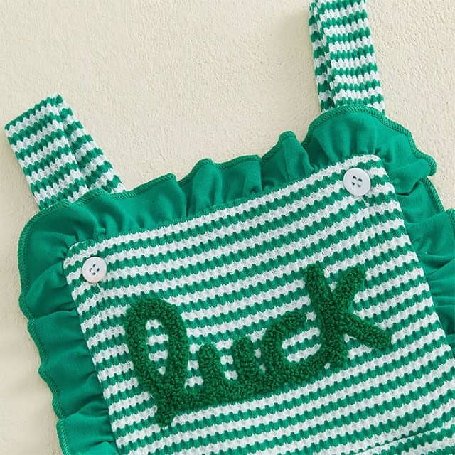 This adorable toddler girl jumpsuit is perfect for celebrating St. Patrick’s Day in festive style. Featuring a charming green and white striped design with sweet ruffle details, decorative bows on the legs, and “Luck” embroidery on the front, this outfit adds a playful holiday touch. The shoulder straps provide a secure and comfortable fit, while the soft, flexible fabric allows easy movement for active little ones.