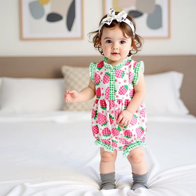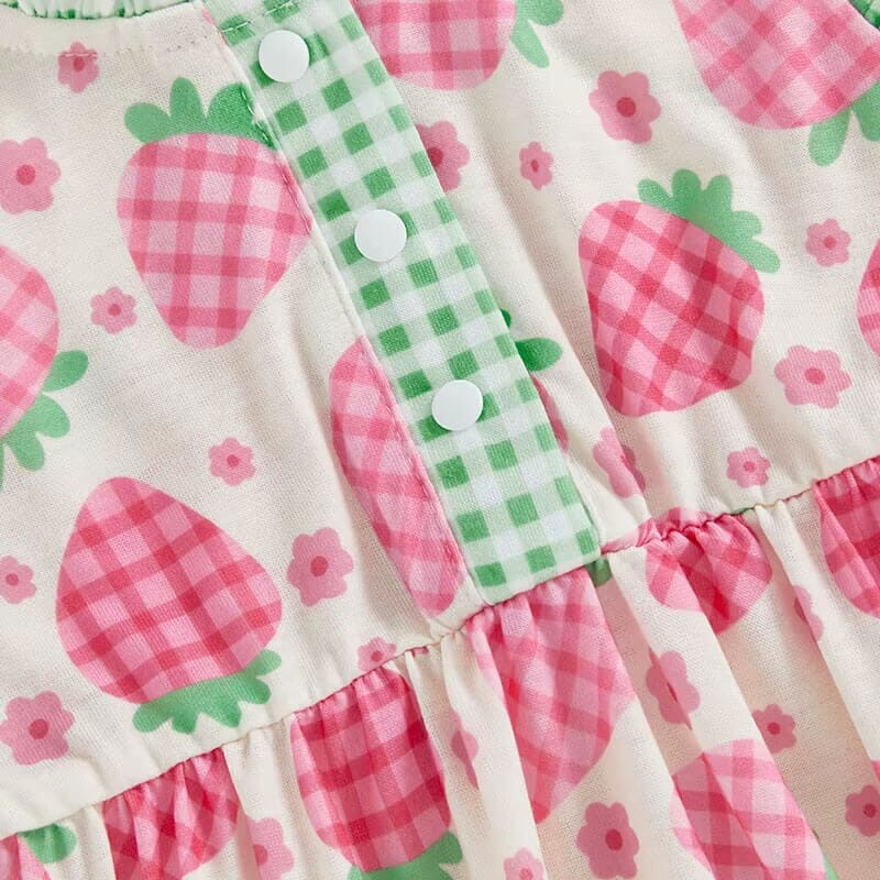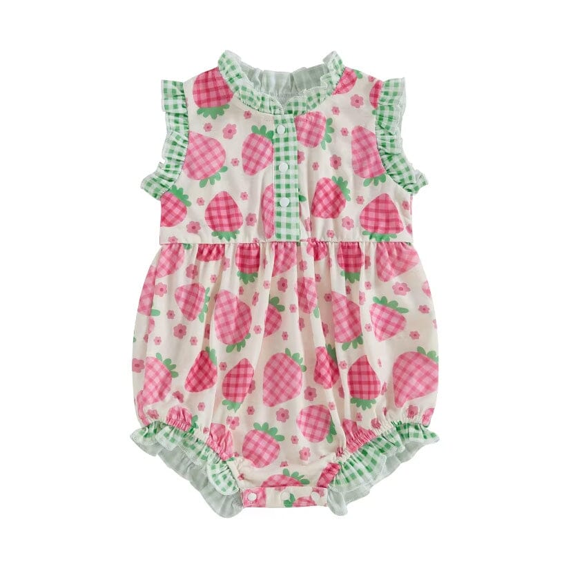 Sweeten up your baby girl's summer with this adorable strawberry romper! Covered in cheerful pink gingham strawberries and tiny blossoms, it’s perfect for sunny days and picnic playdates. The ruffled green gingham trim adds a charming contrast at the sleeves, collar, and leg cuffs. Snap closures at the bottom ensure quick diaper changes without any fuss.