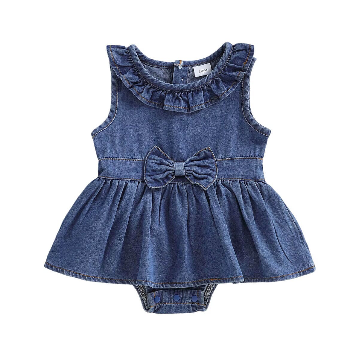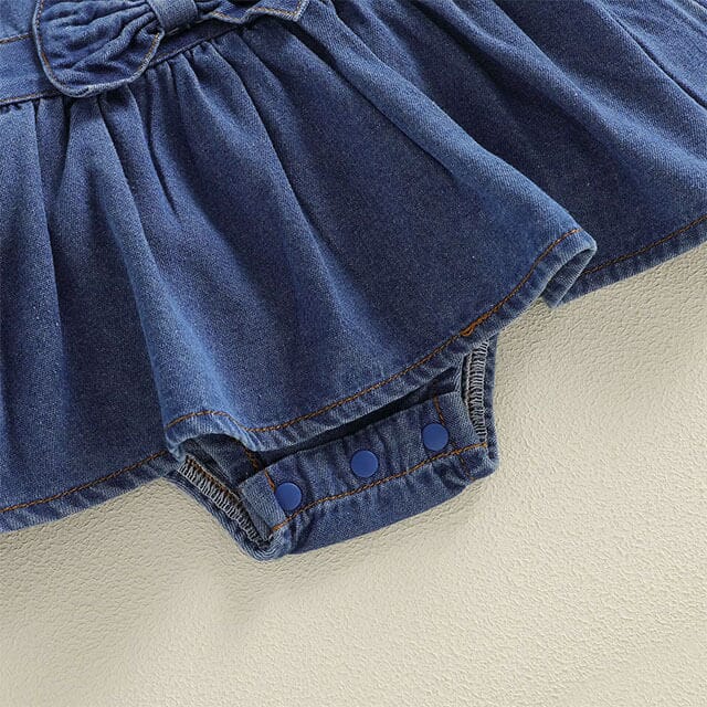 This sweet baby girl romper combines classic denim style with adorable feminine details. Featuring a soft ruffled neckline and a charming bow at the waist, it creates a timeless and elegant look. The attached skirt adds a dress-like feel while keeping the comfort of a romper. Perfect for everyday wear, special outings, or photo moments, this romper is both stylish and practical.