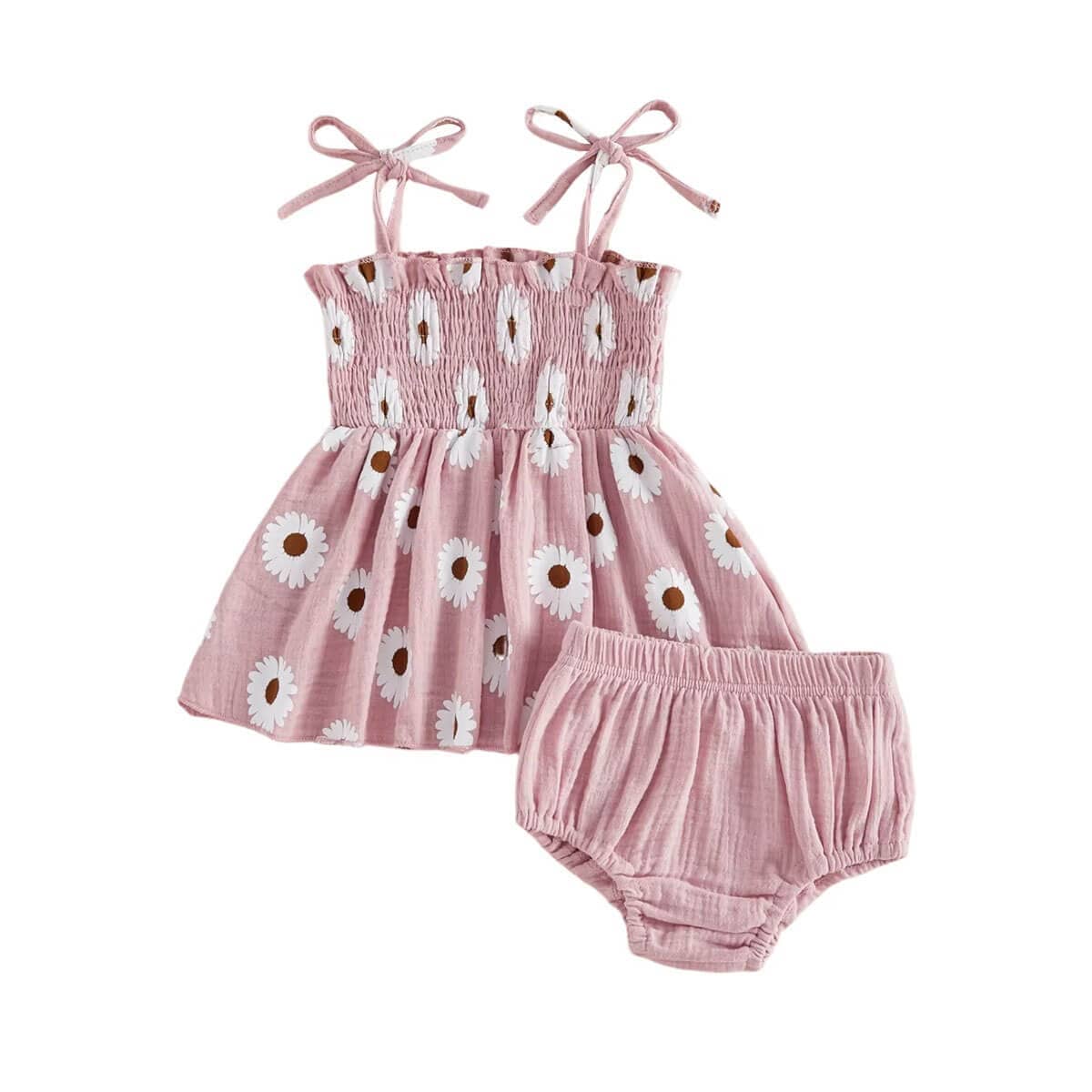 This adorable baby girl outfit set features a charming daisy print top with matching bloomers, perfect for warm, sunny days and special outings. The sleeveless top has delicate shoulder tie straps and a stretchy smocked bodice that provides a comfortable, flexible fit while creating a sweet, timeless look. Ideal for everyday wear, family gatherings, vacations, or photo sessions, this lovely set is available in three beautiful colors to suit every style.